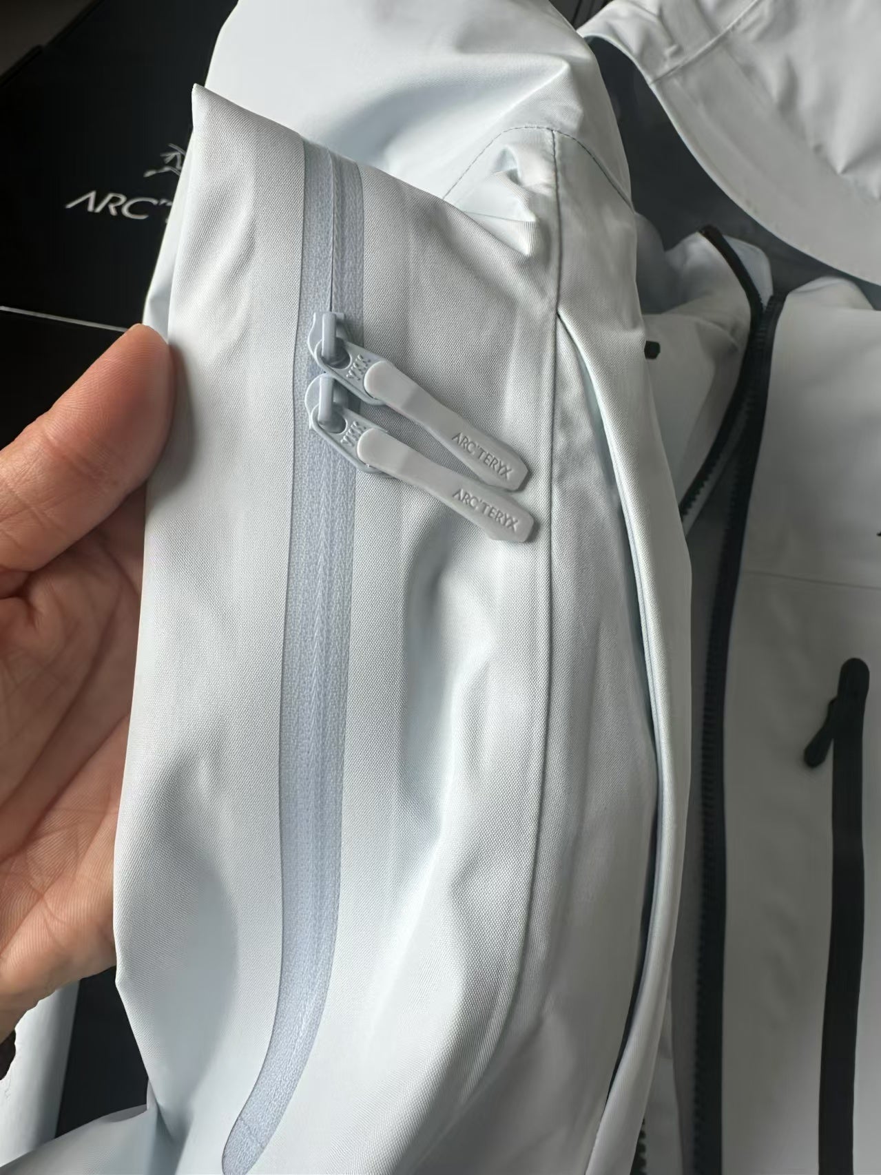 Left arm pocket with weather-resistant zipper for small essentials.