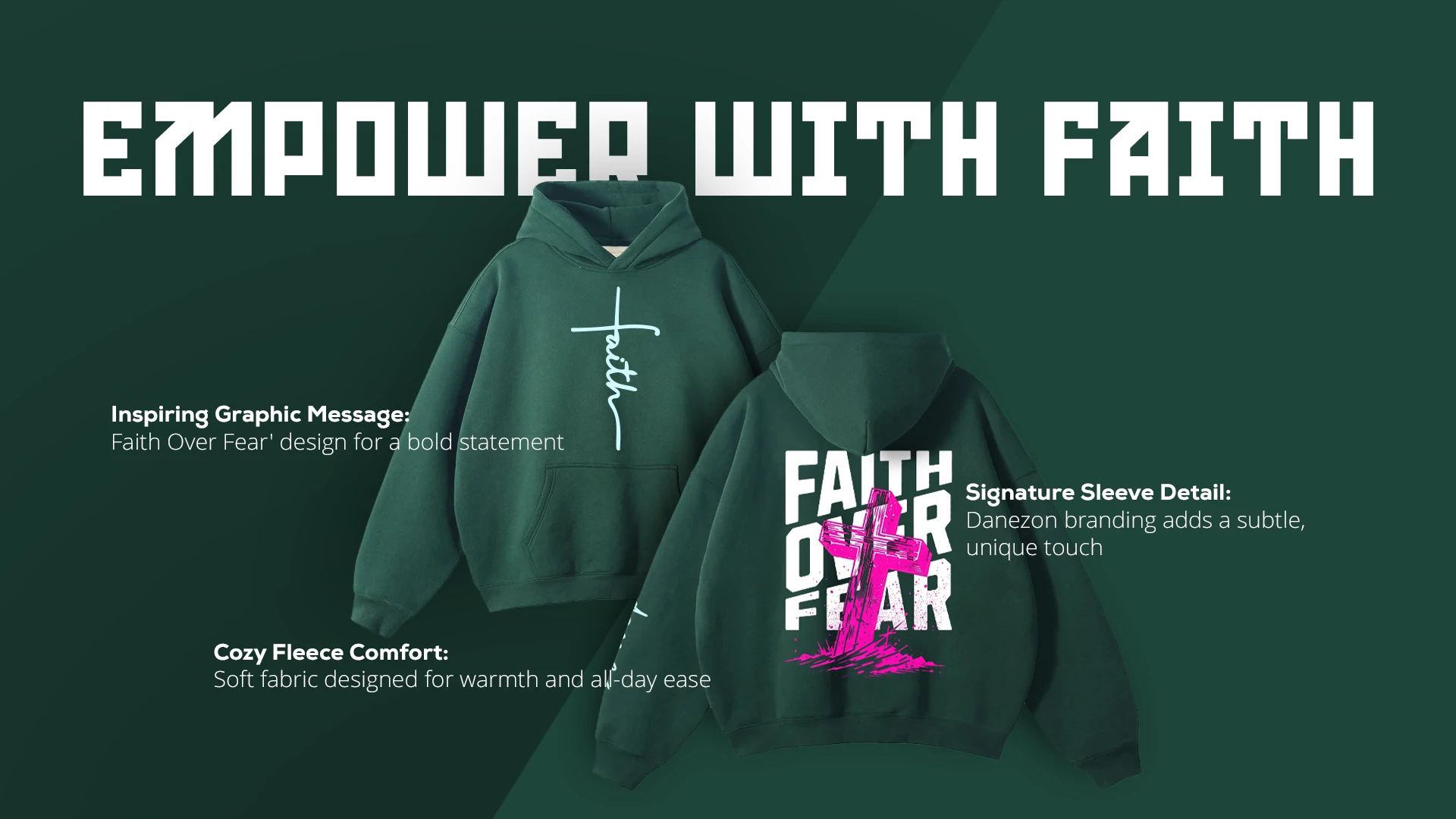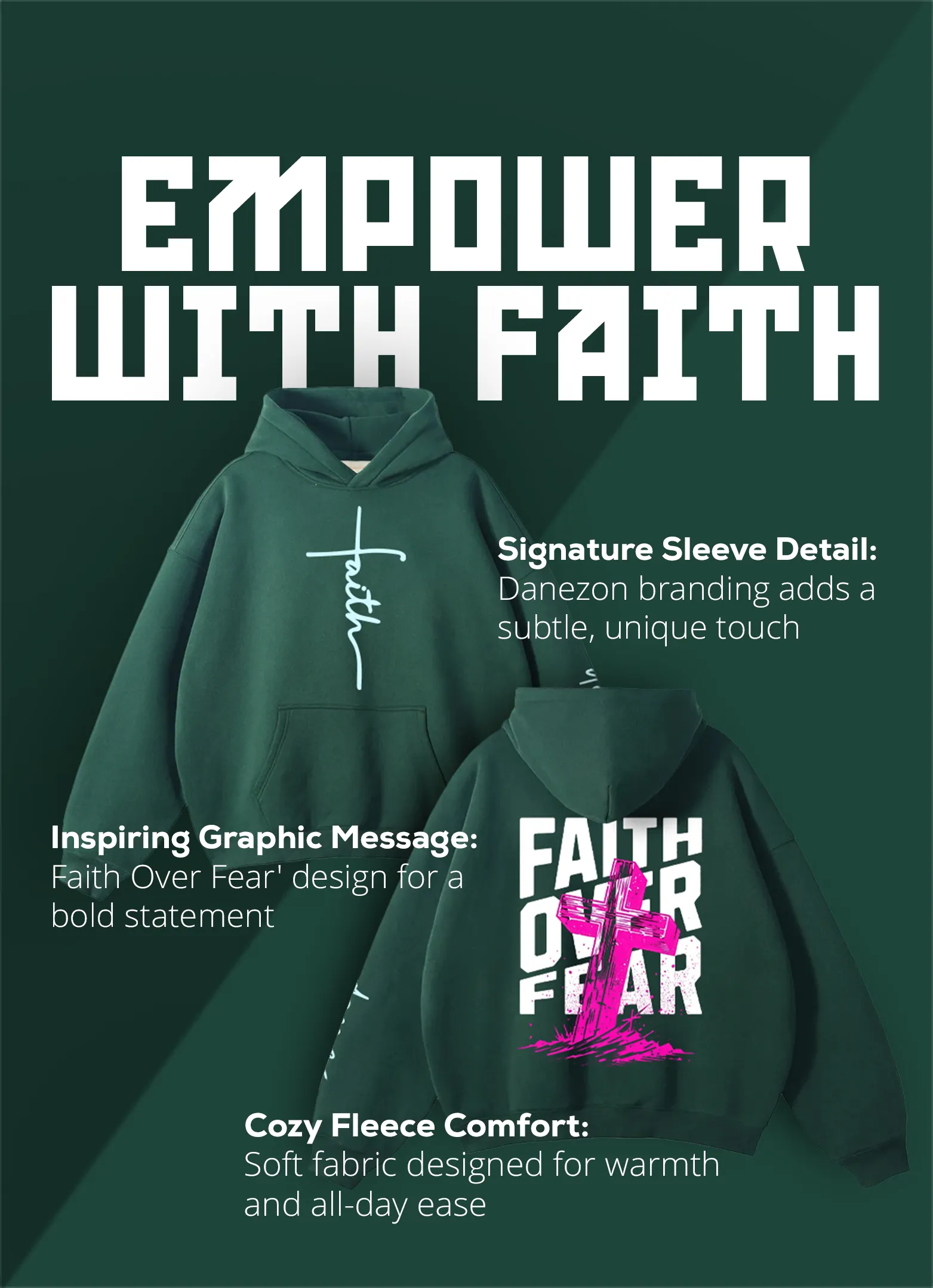 This Faith Over Fear Pullover Green Hoodie by Danezon is the perfect balance of comfort and strength, made from fleece fabric that’s soft yet durable. The message behind it isn’t just inspiring; it’s a daily reminder to live with purpose.