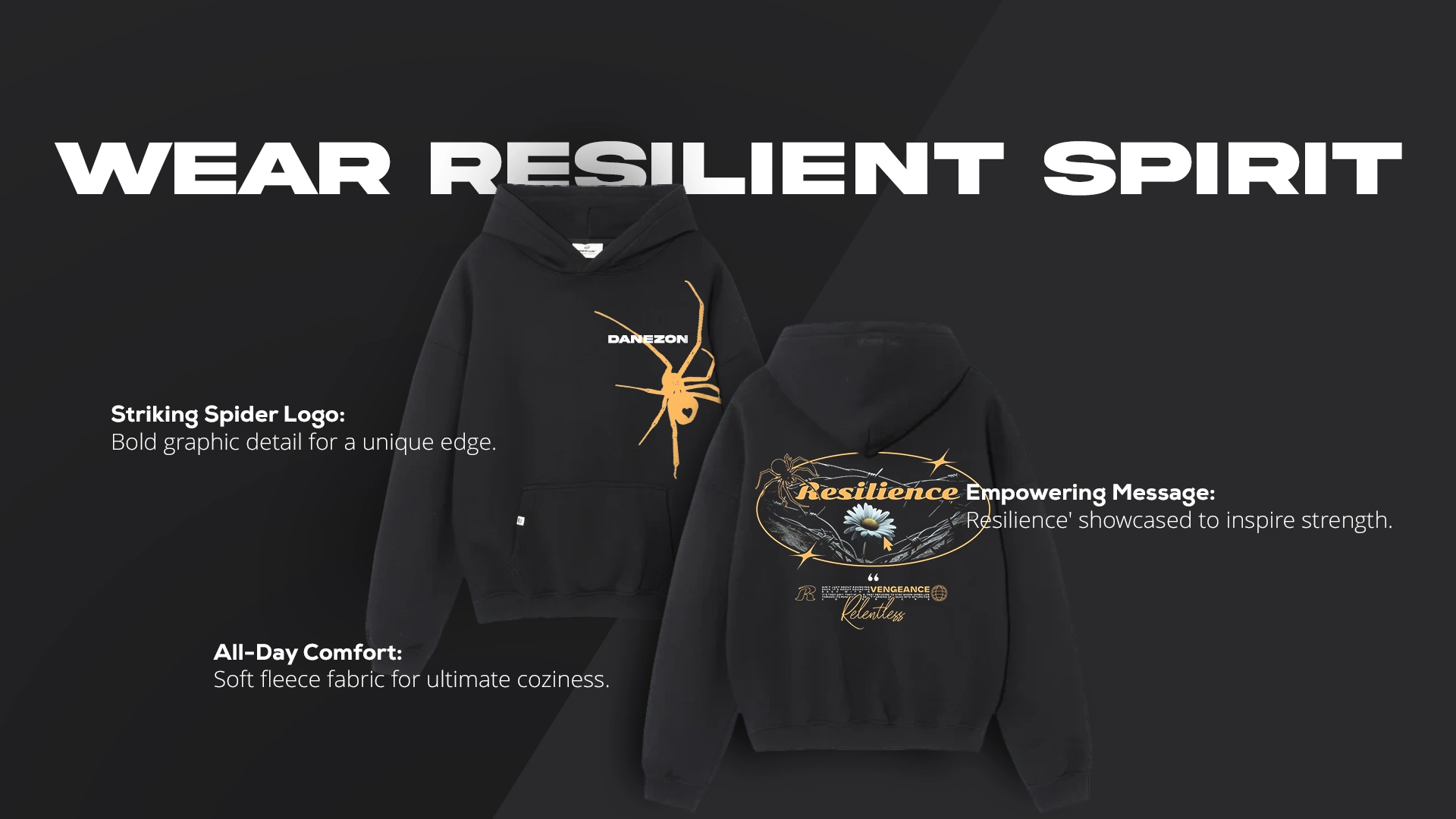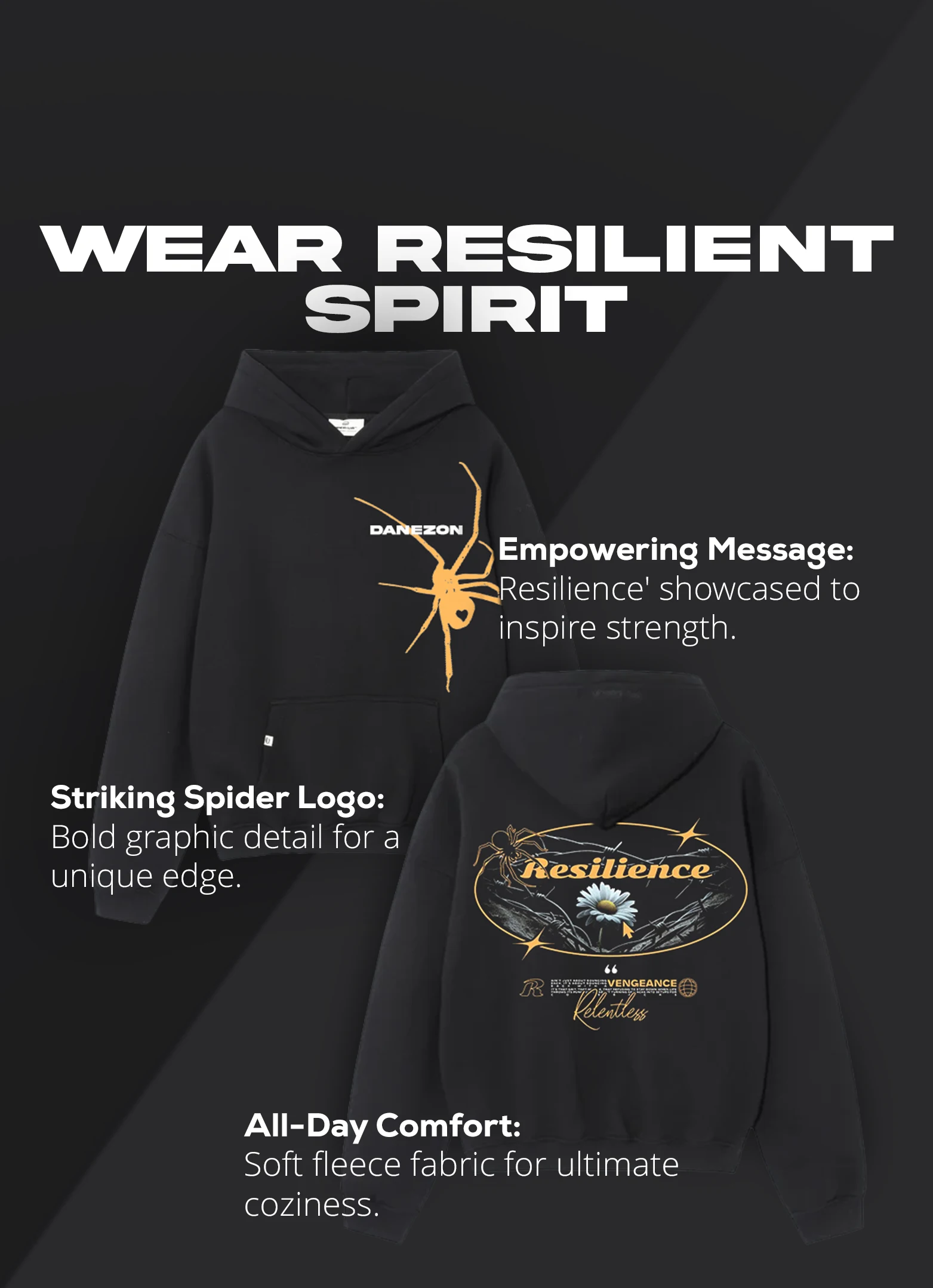 Have you ever worn something that feels like it’s speaking your language? This Resilience Danezon Black Hoodie isn’t just another wardrobe staple—it’s a mixture of style and motivation. The front subtly boasts a DANEZON graphic paired with a bold yellow spider, making it the perfect statement piece without going overboard. Turn it around, and “Resilience” reminds you of the grit and determination that define your journey.