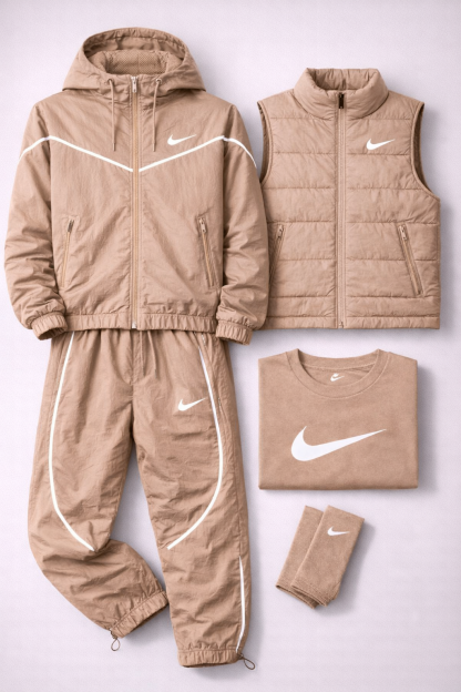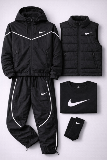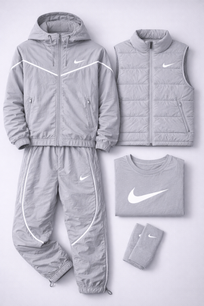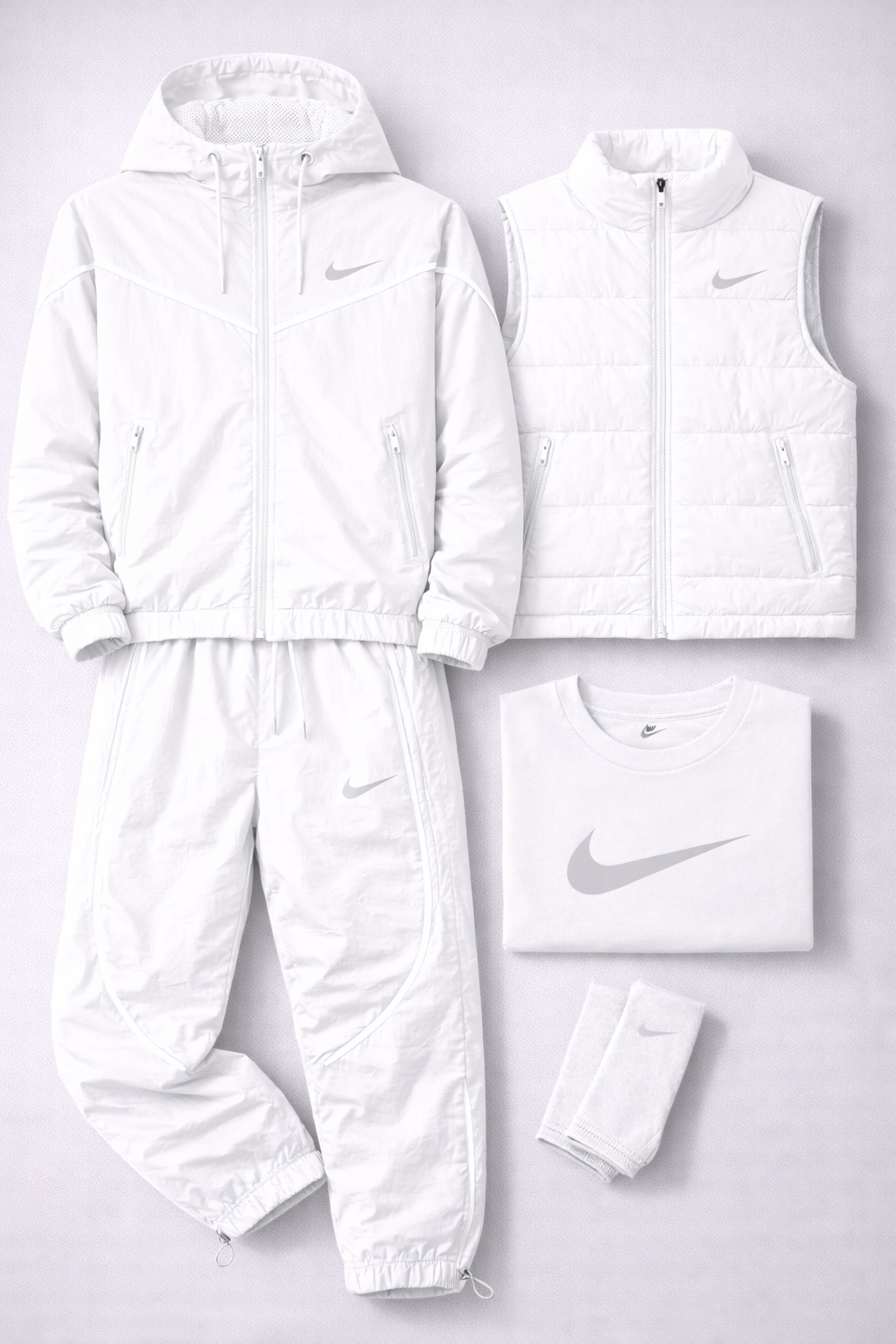 The Arctic Motion Set combines comfort, urban style, and functionality in a complete outfit designed for the transitional season. Crafted from soft, technical fabrics, the set includes a lightweight jacket, a sleeveless vest, pants, a T-shirt, and matching socks, creating a clean, modern look. The minimalist design featuring the iconic swoosh enhances the streetwear aesthetic, while the layered construction ensures versatility and practicality in any situation. Perfect for those seeking performance, comfort, and contemporary style in a single outfit.