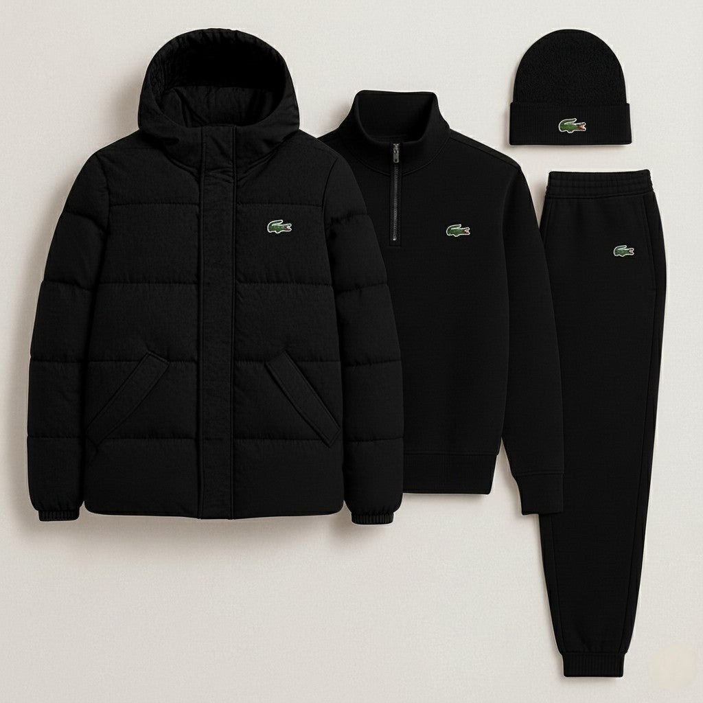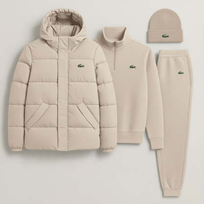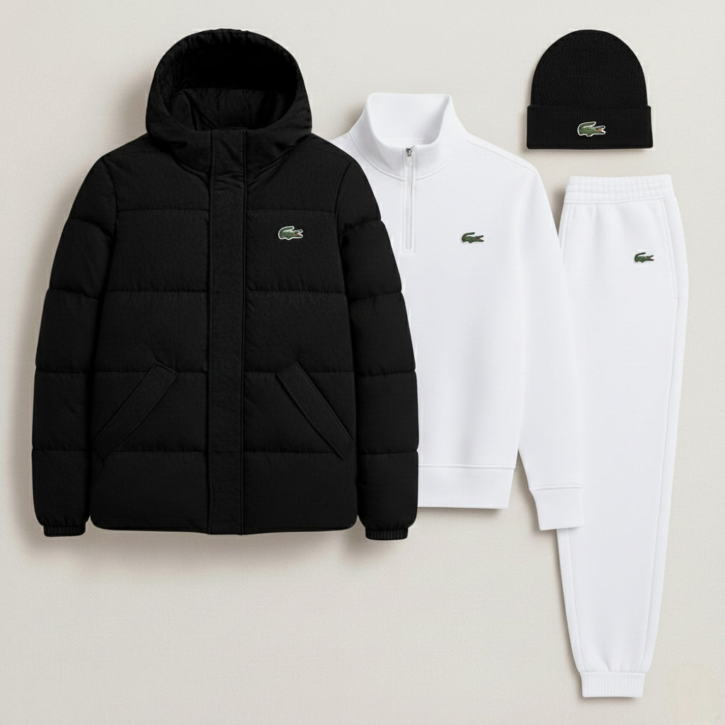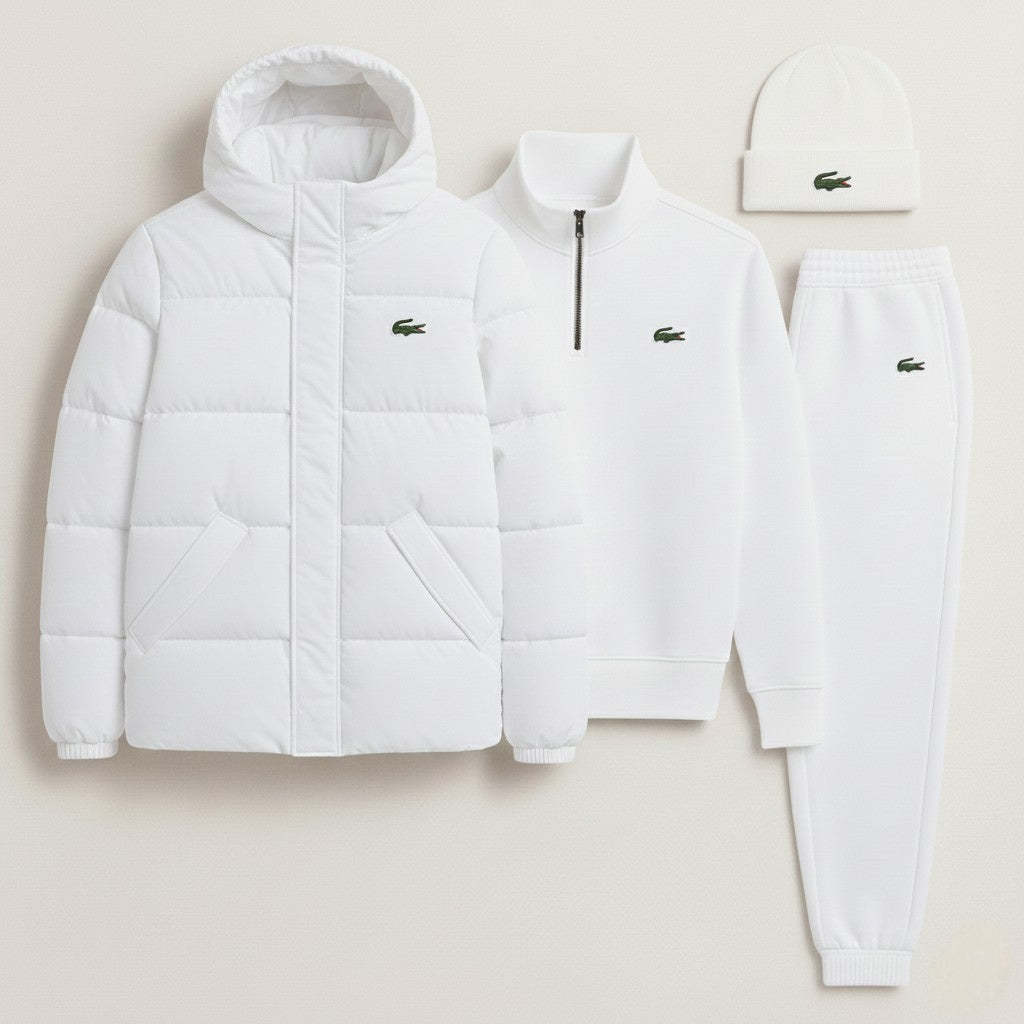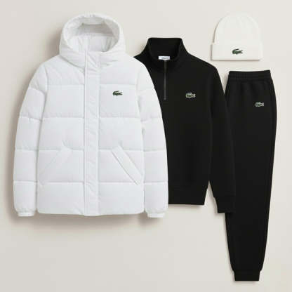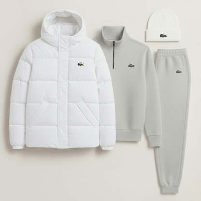 Le blouson doudoune et le bonnet, éléments phares de cette tenue, sont pensés pour affronter l'hiver avec légèreté. La doudoune, dotée d'une capuche enveloppante et d'un matelassage isolant, assure une protection maximale contre le froid sans alourdir la silhouette. Le bonnet assorti vient parfaire ce look, assurant chaleur et style intemporel. Des motifs iconiques sur la poitrine et le couvre-chef témoignent d'une identité sportive raffinée.