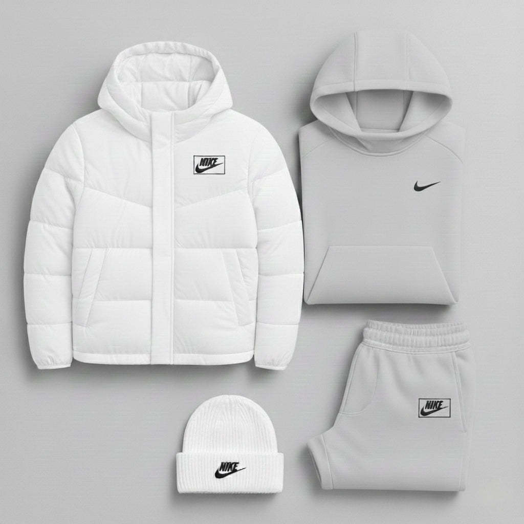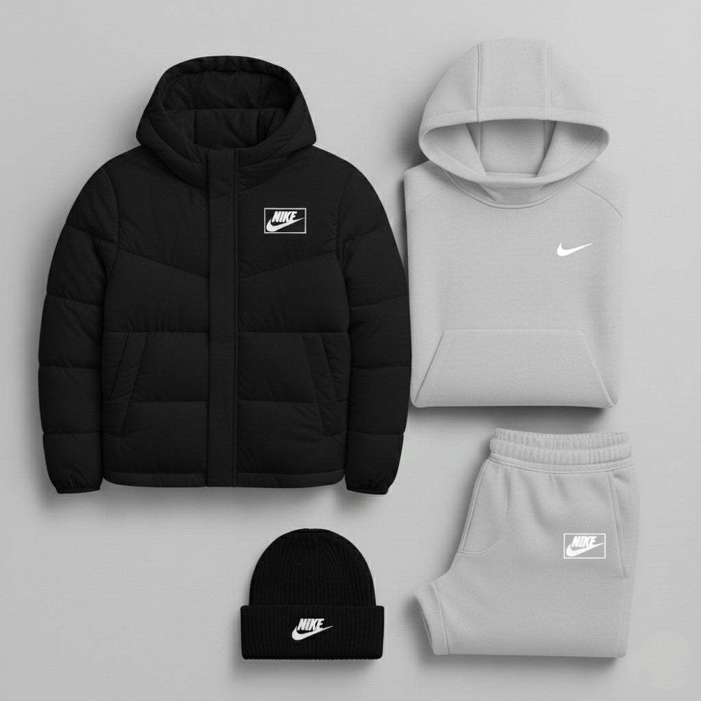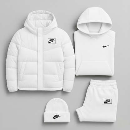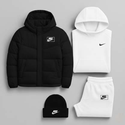 Le blouson matelassé et le bonnet, pièces maîtresses de cet ensemble, sont conçus pour offrir une chaleur maximale sans compromettre la légèreté. La doudoune, avec sa capuche protectrice et son design épuré, assure une isolation optimale contre le froid. Le bonnet assorti complète l'ensemble, idéal pour affronter les journées les plus fraîches avec style. Des détails graphiques emblématiques sur la poitrine et le bonnet signent un look authentique.